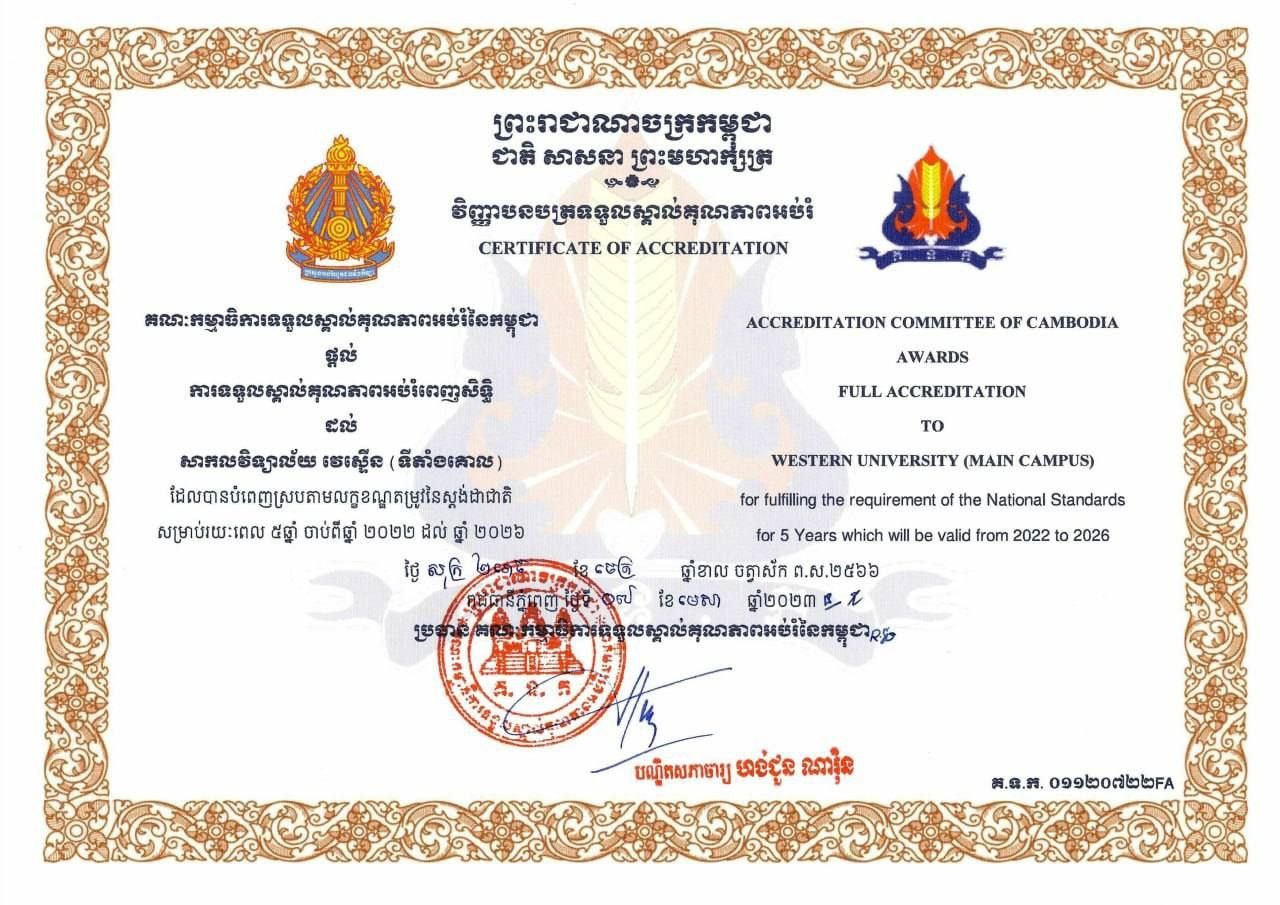 សាកលវិទ្យាល័យវេស្ទើន បានទទួលវិញ្ញាបនបត្រទទួលស្គាល់គុណភាពអប់រំ ពីគណៈកម្មការធិការទទួលស្គាល់គុណភាពអប់រំនៃកម្ពុជា ហៅកាត់ថា ACC ផ្តល់ការទទួលស្គាល់គុណភាពអប់រំពេញសិទ្ធិ ដល់សាកលវិទ្យាល័យវេស្ទើន ដែលបានបំពេញស្របតាមលក្ខខណ្ឌតម្រូវនៃស្តង់ដាជាតិ។