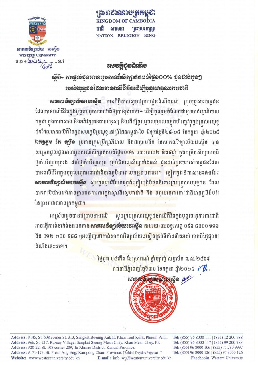 សាកលវិទ្យាល័យវេស្ទើន ប្រកាសផ្ដល់ជូនអាហារូបករណ៍១០០% រហូតដល់ចប់កម្មវិធីសិក្សាទាំងថ្នាក់បរិញ្ញាបត្ររង និងថ្នាក់បរិញ្ញាបត្រ គ្រប់ជំនាញទាំងអស់ ជូនដល់កូនៗរបស់យុទ្ធជនពលីជីវិត ដើម្បីបុព្វហេតុការពារជាតិ។