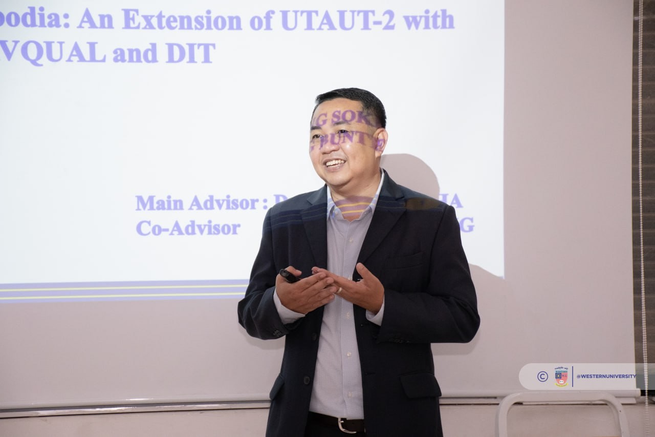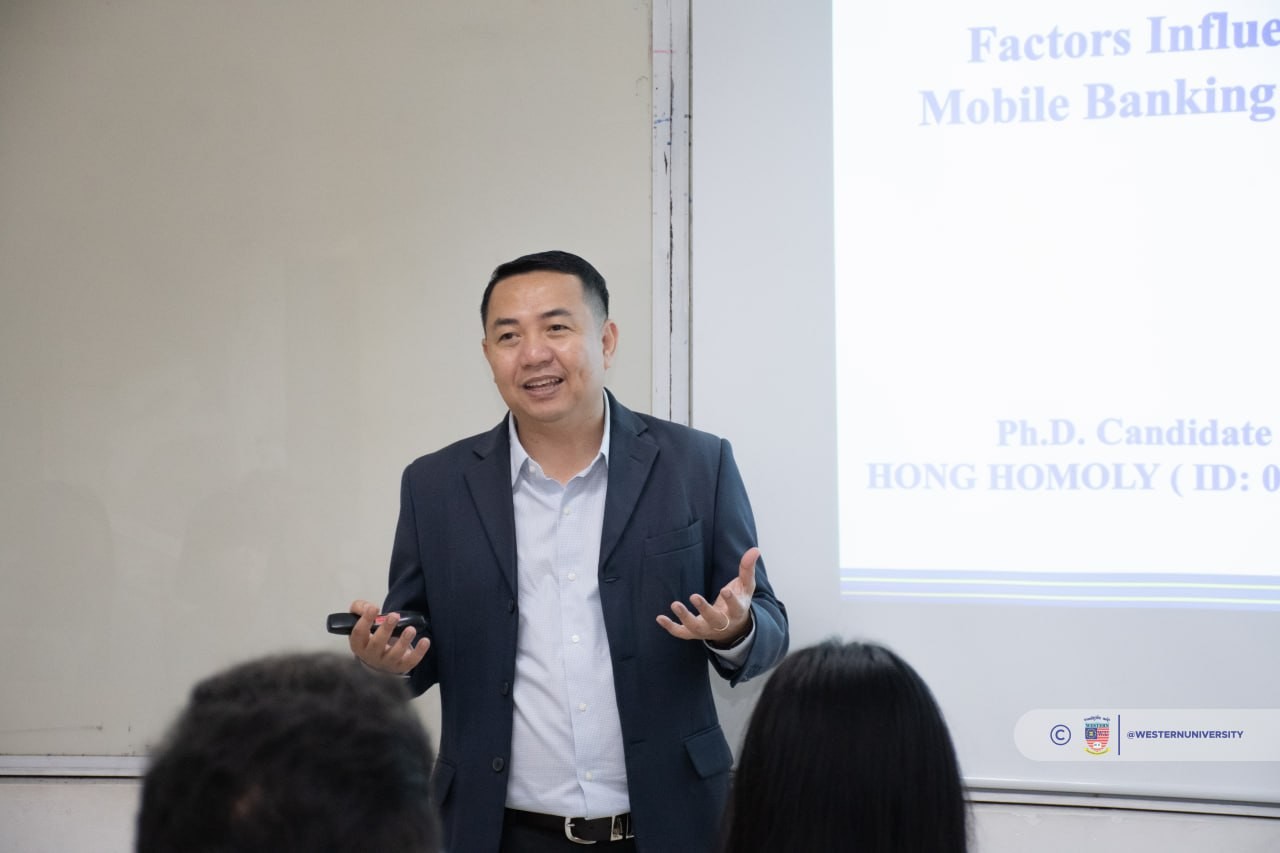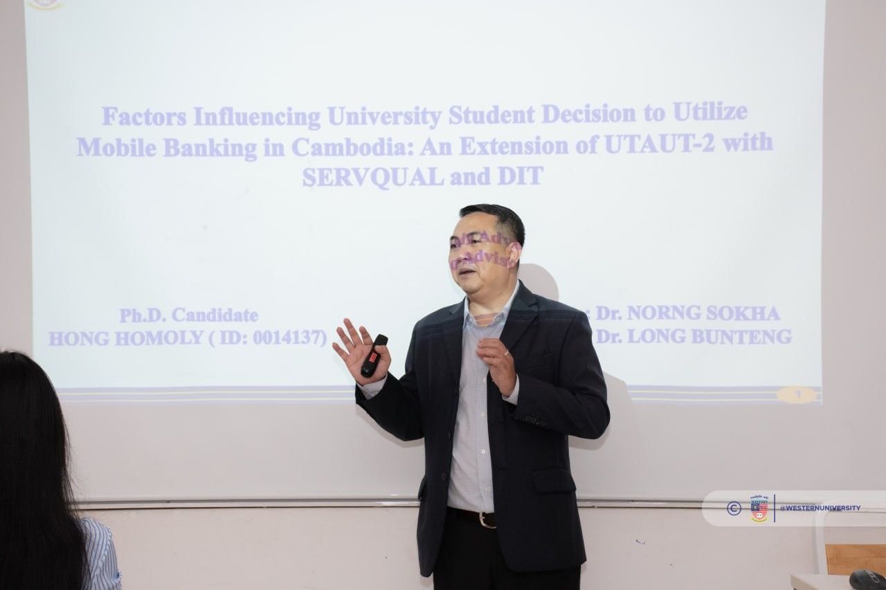 ព្រឹកថ្ងៃទី ២០ ខែសីហា ឆ្នាំ ២០២៥ បេក្ខជន ហុង ហោម្មលី បានធ្វើបទបង្ហាញលទ្ធផលចុងក្រោយនៃការស្រាវជ្រាវ ដែលផ្តោតលើ ឥរិយាបទក្នុងការប្រើប្រាស់សេវាធនាគារចល័ត (Mobile Banking Service)។ ការស្រាវជ្រាវត្រូវបានអនុវត្តដោយប្រើវិធីសាស្ត្រវិភាគបែបបរិមាណវិស័យ ដែលបង្ហាញពីកត្តាជាច្រើនមានឥទ្ធិពលដល់ការសម្រេចចិត្តរបស់អតិថិជនក្នុងការប្រើប្រាស់សេវាធនាគារចល័ត។លទ្ធផលស្រាវជ្រាវបានផ្តល់ឱ្យមានទស្សនៈថ្មីសម្រាប់ការយល់ដឹងអំពីការទទួលយកបច្ចេកវិទ្យា នៅក្នុងទីផ្សារកំពុងអភិវឌ្ឍន៍ និងបង្ហាញពី អាកប្បកិរិយាឌីជីថលពិសេសរបស់អ្នកប្រើវ័យក្មេងនៅកម្ពុជា។